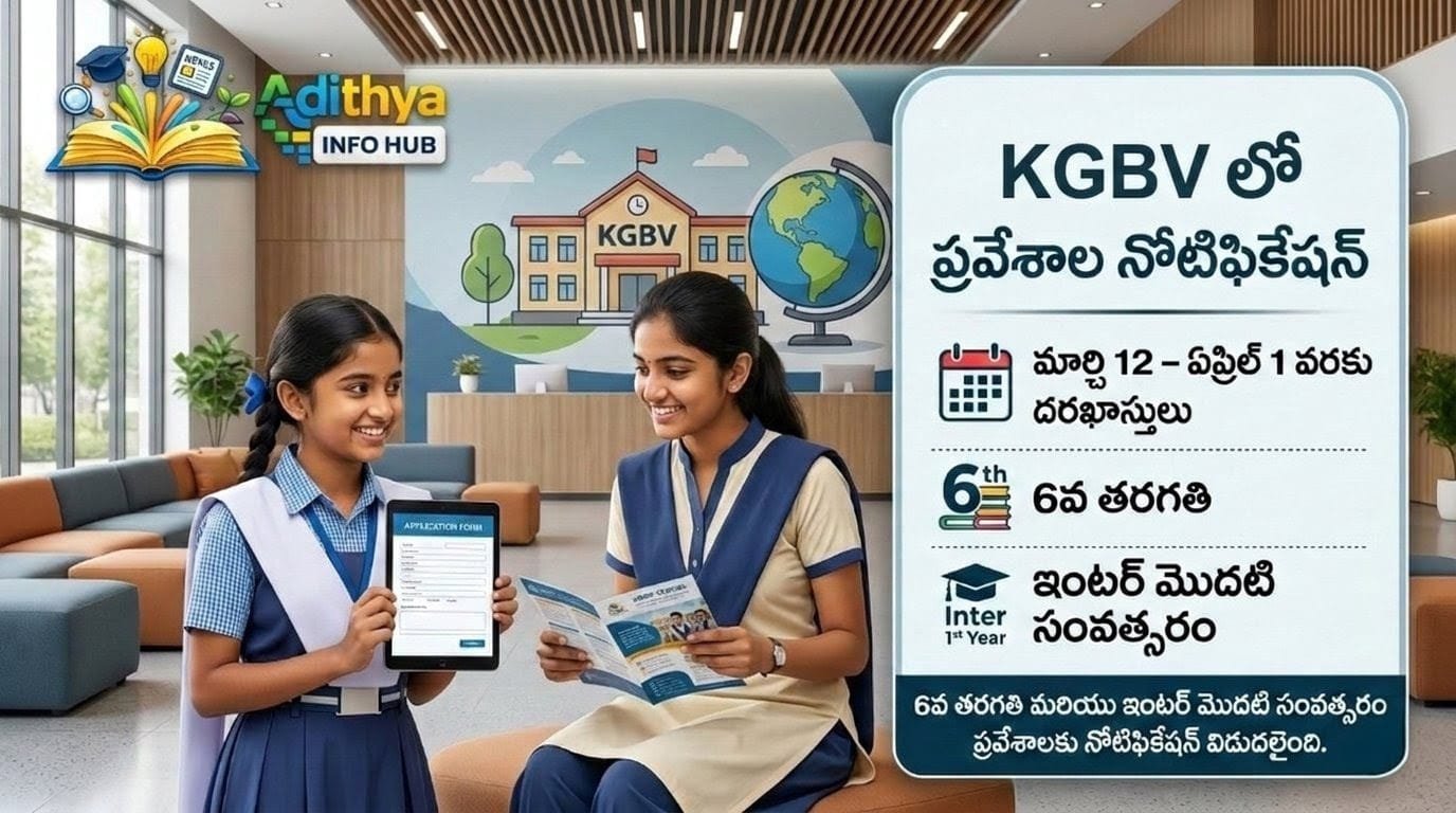 AP Kasturba Gandhi Balika Vidyalaya Admissions 2026 ద్వారా ఆంధ్రప్రదేశ్ రాష్ట్రంలోని KGBV పాఠశాలల్లో బాలికలకు ఉచిత వసతి విద్య అందించే అవకాశం ఉంది. ఈ అడ్మిషన్ల ద్వారా 6వ తరగతి మరియు ఇంటర్మీడియట్ తరగతుల్లో ఖాళీగా ఉన్న సీట్లకు విద్యార్థినులను ఎంపిక చేస్తారు. ఈ పాఠశాలల్లో విద్యతో పాటు వసతి, ఆహారం, పాఠ్యపుస్తకాలు మరియు ఇతర అవసరమైన సౌకర్యాలు పూర్తిగా ఉచితంగా అందించబడతాయి. ఆన్లైన్ దరఖాస్తులు 13 మార్చి 2026 వరకు స్వీకరించబడతాయి.