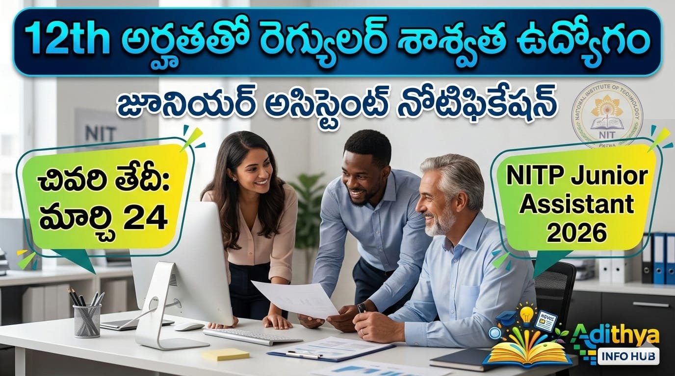 NIT Junior Assistant Recruitment 2026 నోటిఫికేషన్ విడుదలైంది. National Institute of Technology (NIT) లో నాన్-టీచింగ్ కేటగిరీ కింద Junior Assistant మరియు ఇతర పోస్టుల భర్తీ కోసం అప్లికేషన్లు ఆహ్వానించబడుతున్నాయి. ఈ రిక్రూట్‌మెంట్ ద్వారా కేంద్ర ప్రభుత్వ సంస్థలో ఉద్యోగం పొందే అవకాశం ఉంటుంది.